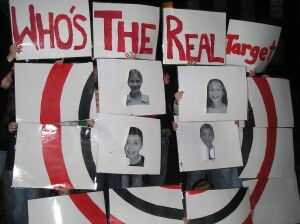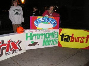As part of the demonstration the students also created a large target that asked the question: “Who is the real target (of candy flavored tobacco)?” Students spoke to pedestrians as they passed by and handed out palm cards with messages on them regarding the tactics of the tobacco industry. To make their point the students also made large cardboard mock-ups of common candy products and gave them tobacco consequence related names – so that Starburst became “Tarburst” and Lifesavers became “Lifestoppers” (see photo).