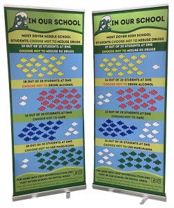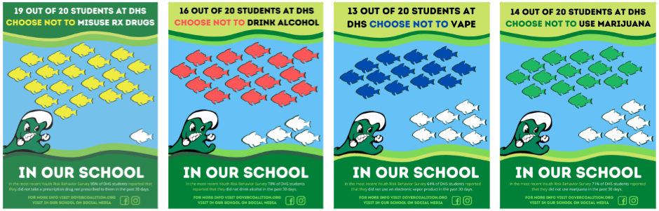The In Our School campaign was developed using Youth Risk Behavior Survey (YRBS) data for Dover Middle School and Dover High School. We used the YRBS findings for the percentage of students who used substances (prescription drugs not prescribed to them, alcohol, marijuana, or e-cigarettes) in the past 30 days. We then used these results to calculate the percentage of students who did not use a particular substance. We focused on the past 30 days for high school students and lifetime for middle school students. This percentage was converted into a number of students out of 20 (conversion to a number of students out of 10 also displays well and may work better depending on your data). By flipping the statistic around to instead show how many students choose not to use substances, the In Our School campaign emphasizes the fact that the majority of students don’t use substances.